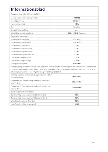 Hisense DHGE901 a une moins bonne classe d'efficacité énergétique que le sèche-linge moyen (A++ contre A+++ ). Le sèche-linge moyen a une classe d'efficacité énergétique de A+++ .